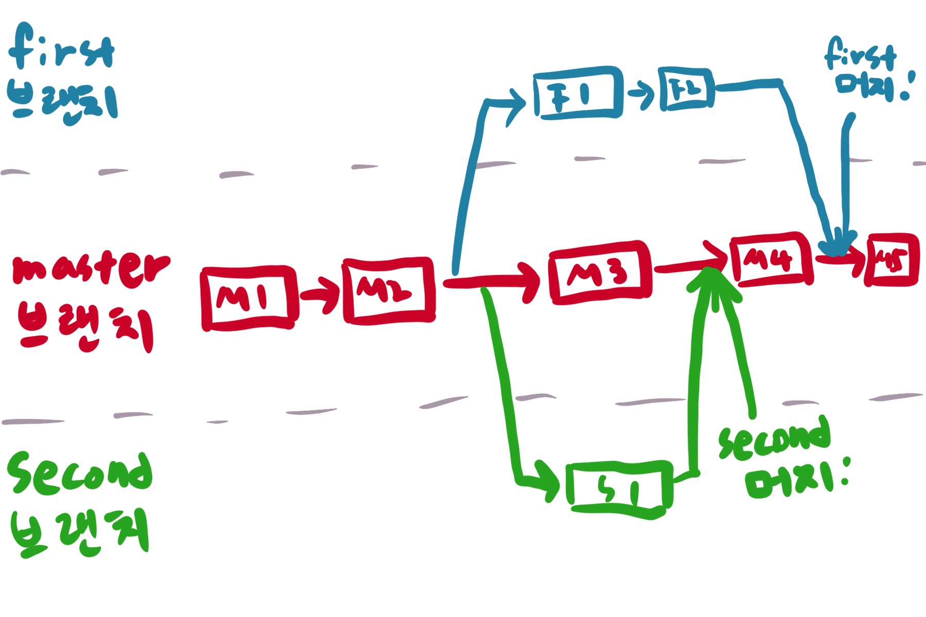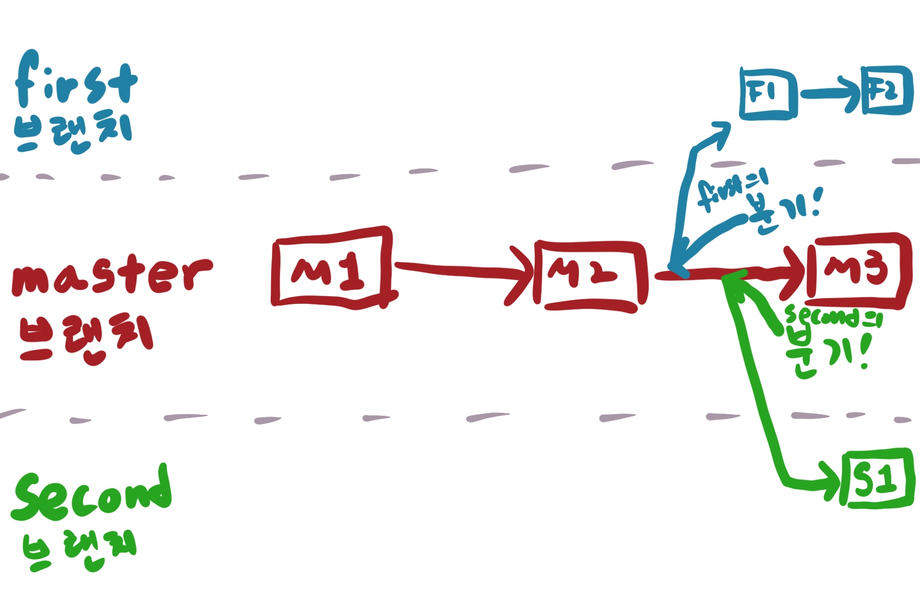 그림에서 마스터 브랜치의 M2 커밋에서 M3 커밋 사이에 first 브랜치와 second 브랜치가 생성된 걸 볼 수 있죠?