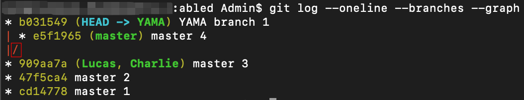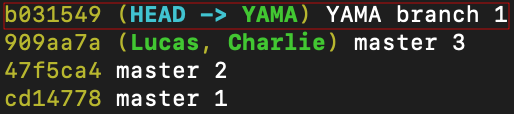 결과 화면을 보면 커밋 메시지 왼쪽에 (HEAD -> YAMA), (master), (Lucas, Charlie)라고 표시되어 있는 게 보이시죠?