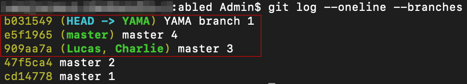 현재 우리는 YAMA 브랜치에서 작업 중이며 YAMA 브랜치의 최신 커밋은 "YAMA branch 1"이고, master 브랜치의 최신 커밋은 master 4, Lucas, Charlie 브랜치의 최신 커밋은 master 3 가 되겠습니다.