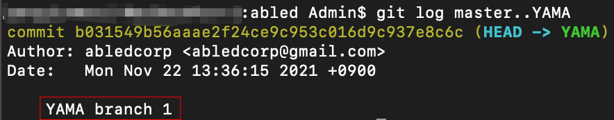 결과 화면을 보시면 master 브랜치에는 없고 YAMA 브랜치에만 있는 커밋 "YAMA branch 1" 커밋을 보여주는 걸 확인할 수 있습니다.