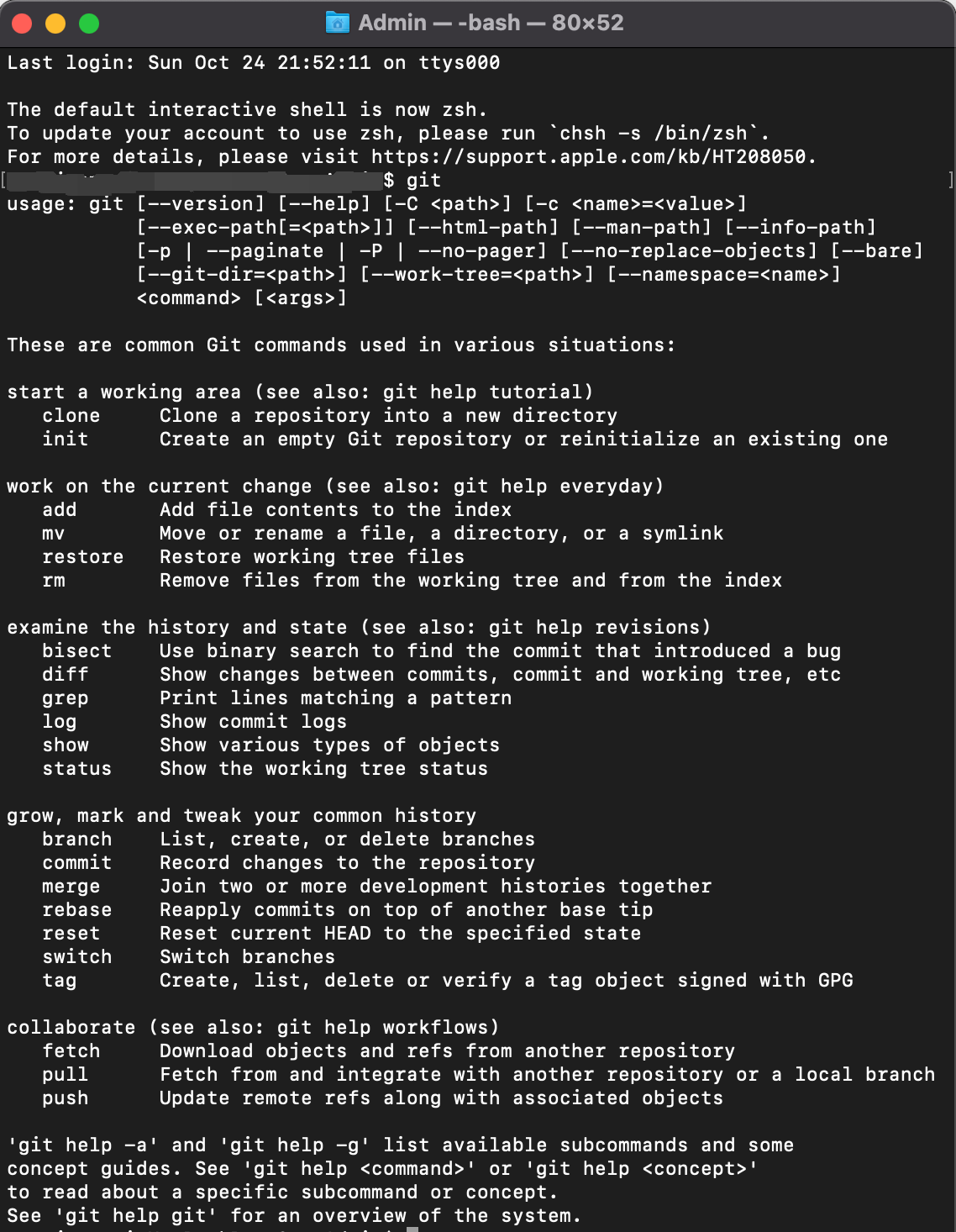 터미널 창이 나타나면 'git'을 입력해 보세요. 깃이 제대로 설치됐다면 git 명령에 쓸 수 있는 옵션들이 나타납니다.