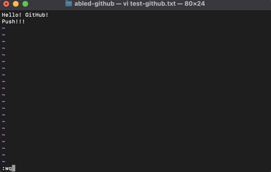 위와 같이 입력하고 저장을 완료하셨다면 이제 수정된 test-github.txt 파일을 'add push'라는 커밋 메시지와 함께 커밋해 주세요!