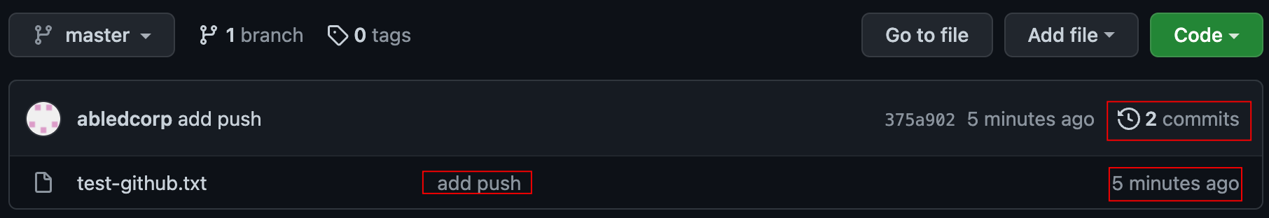 푸시가 끝났으면 깃허브 리포지토리가 열려있는 웹 브라우저 창으로 돌아와 새로고침을 해보시면 로컬에 있던 test-github.txt 파일이 리모트에 올라와 있는 걸 볼 수 있습니다.