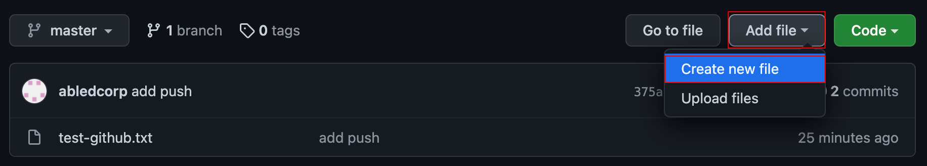 깃허브의 리포지토리 화면에서 오른쪽 상단의 'Add file' 버튼을 누르면 두 가지 옵션이 나오는데 우리는 새로운 파일을 만들 거기 때문에 'Create new file'을 눌러줍니다!