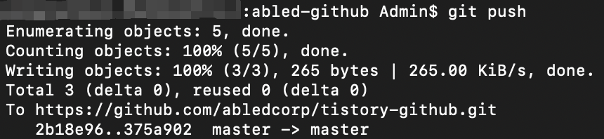터미널 창에서 푸시가 진행되는 것이 보이고 푸시가 끝나면 프롬프트($)가 나타납니다.