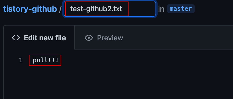 맨 위에 파일 이름을 입력하는 곳에 'test-github2.txt'라고 입력하고 내용은 'pull!!!'을 입력해 줍니다.