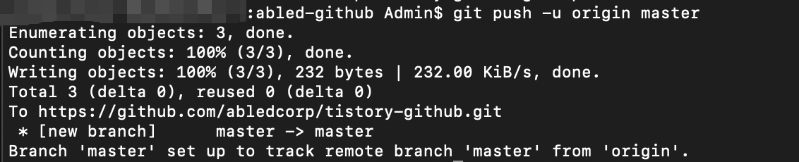 여기에서 '-u' 옵션은 로컬의 브랜치를 리모트의 master 브랜치에 연결하기 위한 것으로 처음에 한 번만 사용하면 됩니다.