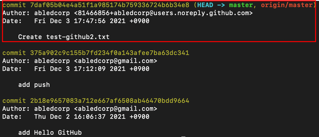 깃허브 리모트 리포지토리에서 만들었던 'Create test-github2.txt'라는 커밋이 로컬 리포지토리 커밋 로그에도 나타나는 것을 확인할 수 있습니다!