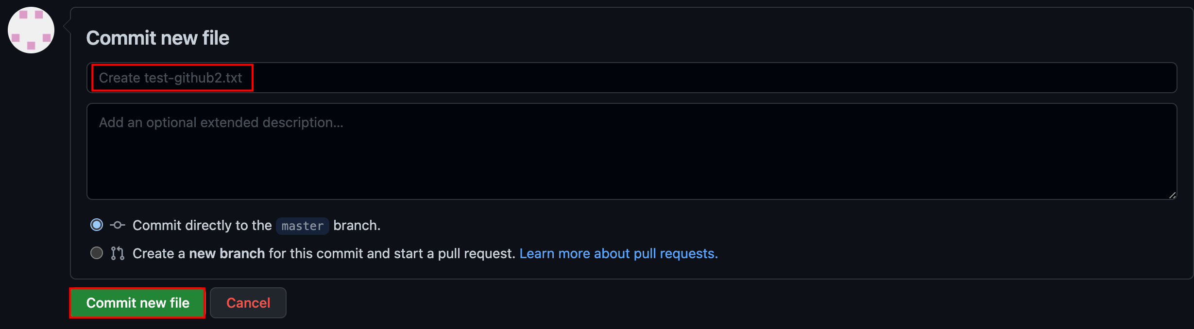 Commit new file이라고 되어있는 곳에 기본적인 커밋 메시지 'Create test-github2.txt'가 입력되어 있는 걸 볼 수 있습니다.