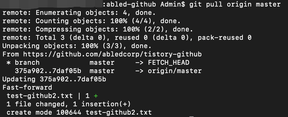 명령어의 의미를 보자면 origin(리모트 리포지토리)의 내용을 master(로컬 리포지토리) 브랜치로 가져온다는 의미입니다!
