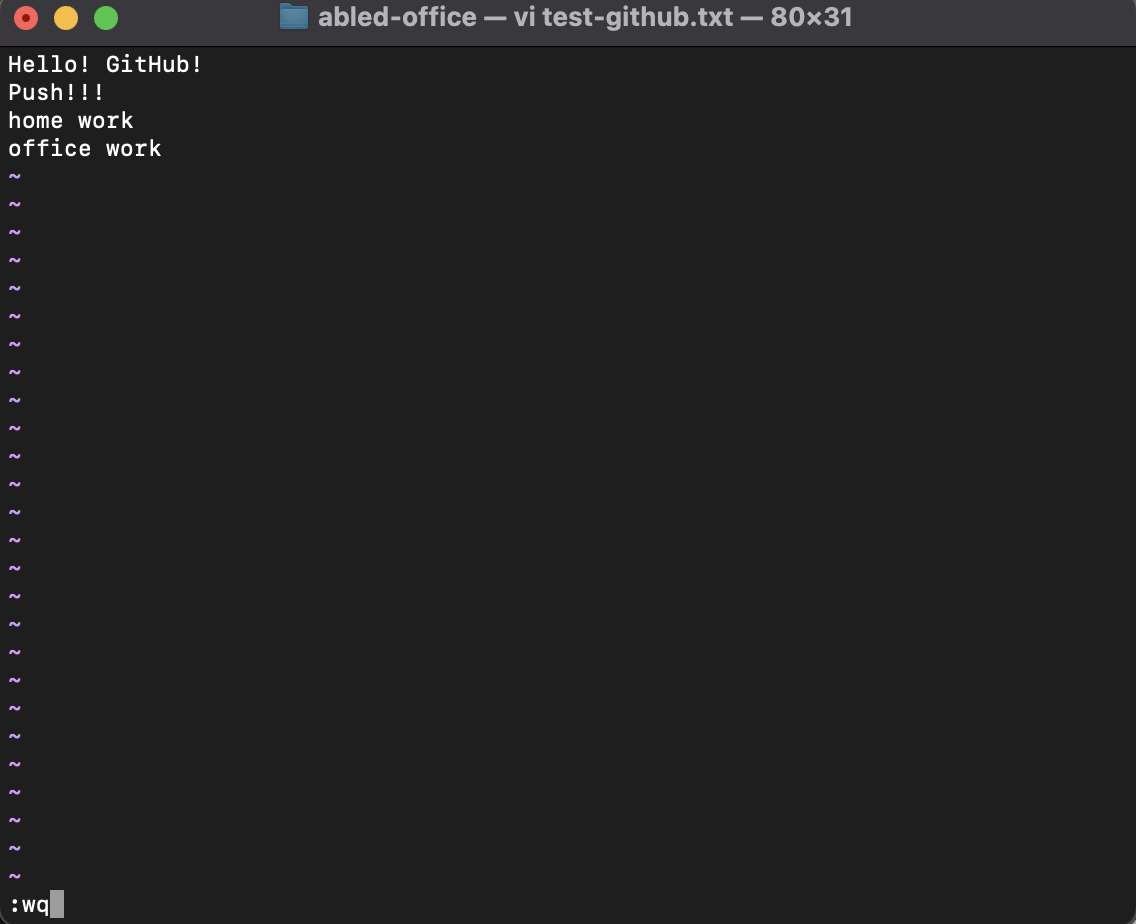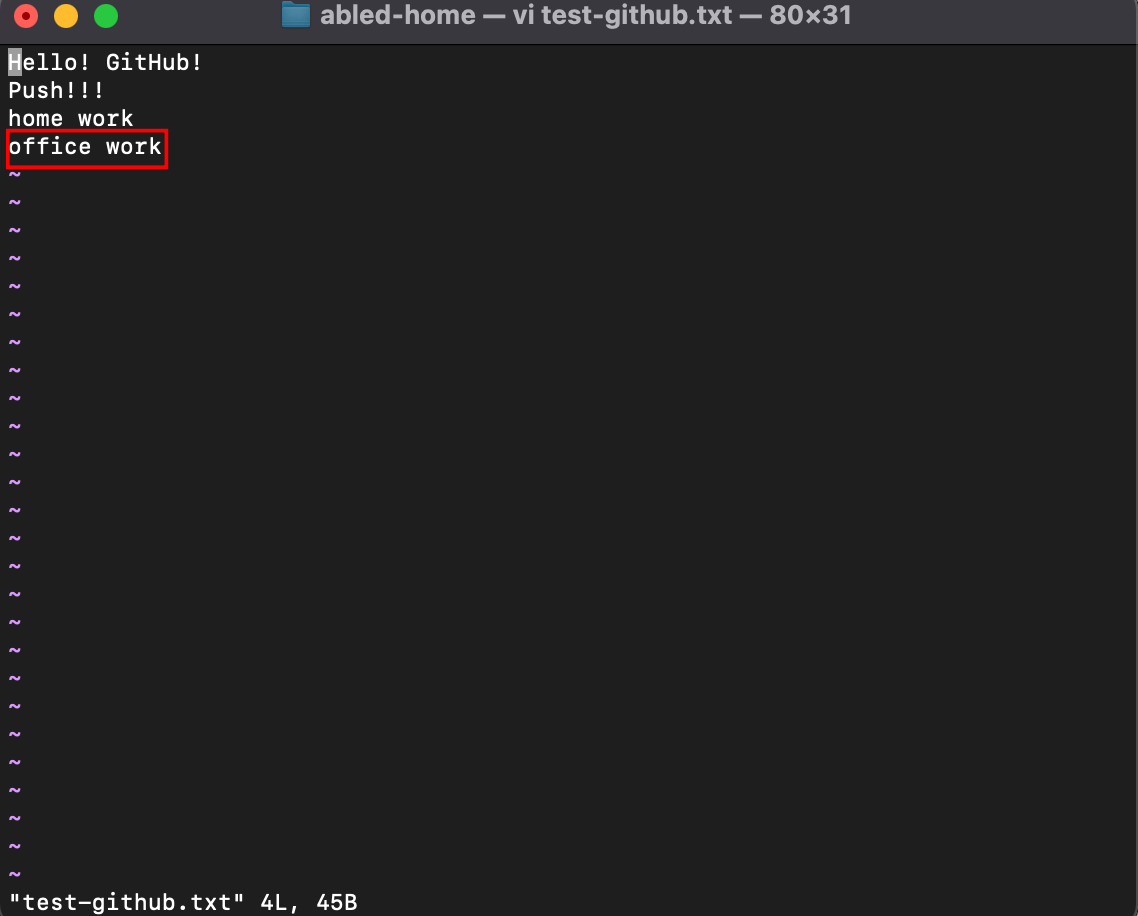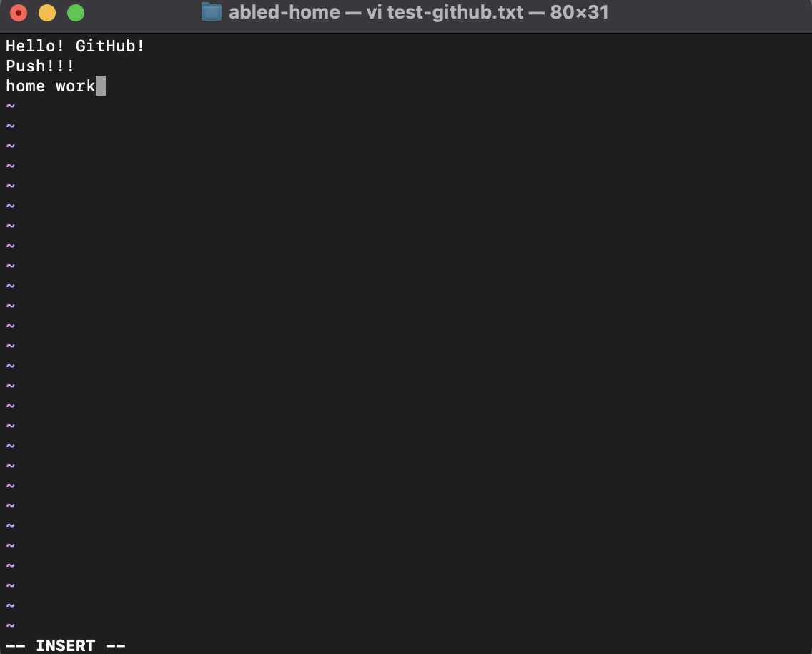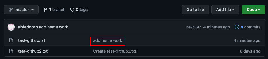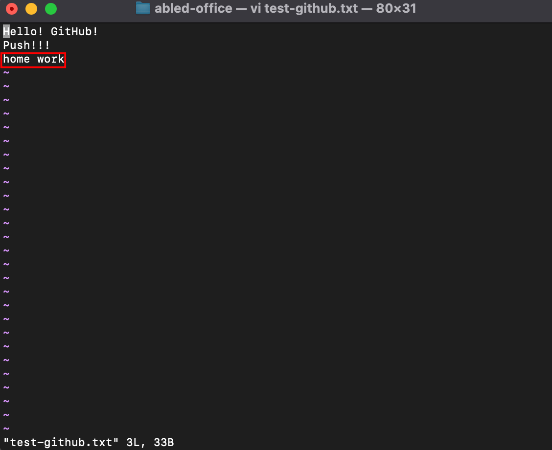 먼저 지난 시간에 만들었던 abled-home 디렉터리에서 test-github.txt 파일을 열고 세 번째 줄에 'home work'라는 내용을 추가하고 저장해 주세요!