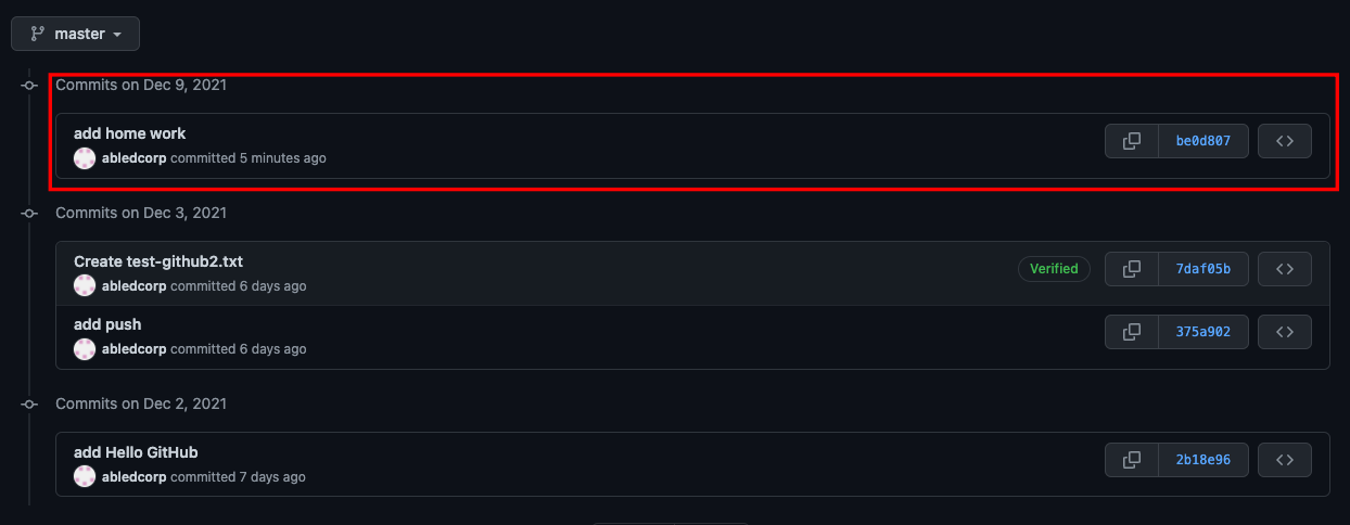 방금 실습하면서 커밋한 "add home work"가 가장 위에 있네요!