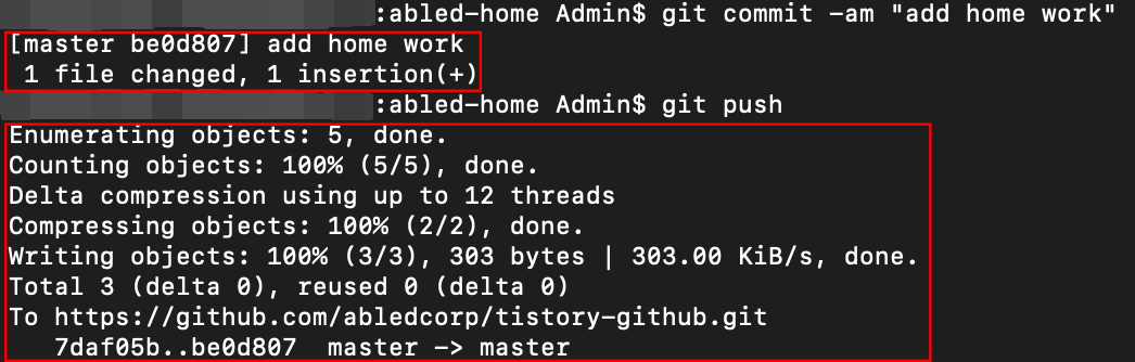 그리고 git push 명령을 사용해 커밋을 리모트 리포지토리에 푸시합니다.