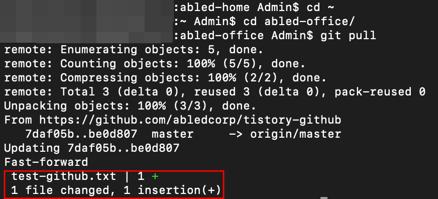 이미 연결시켜 두었기 때문에 바로 abled-office 디렉터리로 이동한 후 git pull 명령을 입력하여 깃 리포지토리에 새로 올라온 커밋을 가져옵시다.