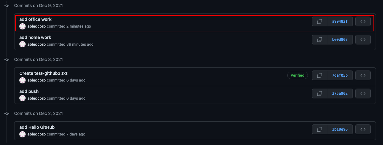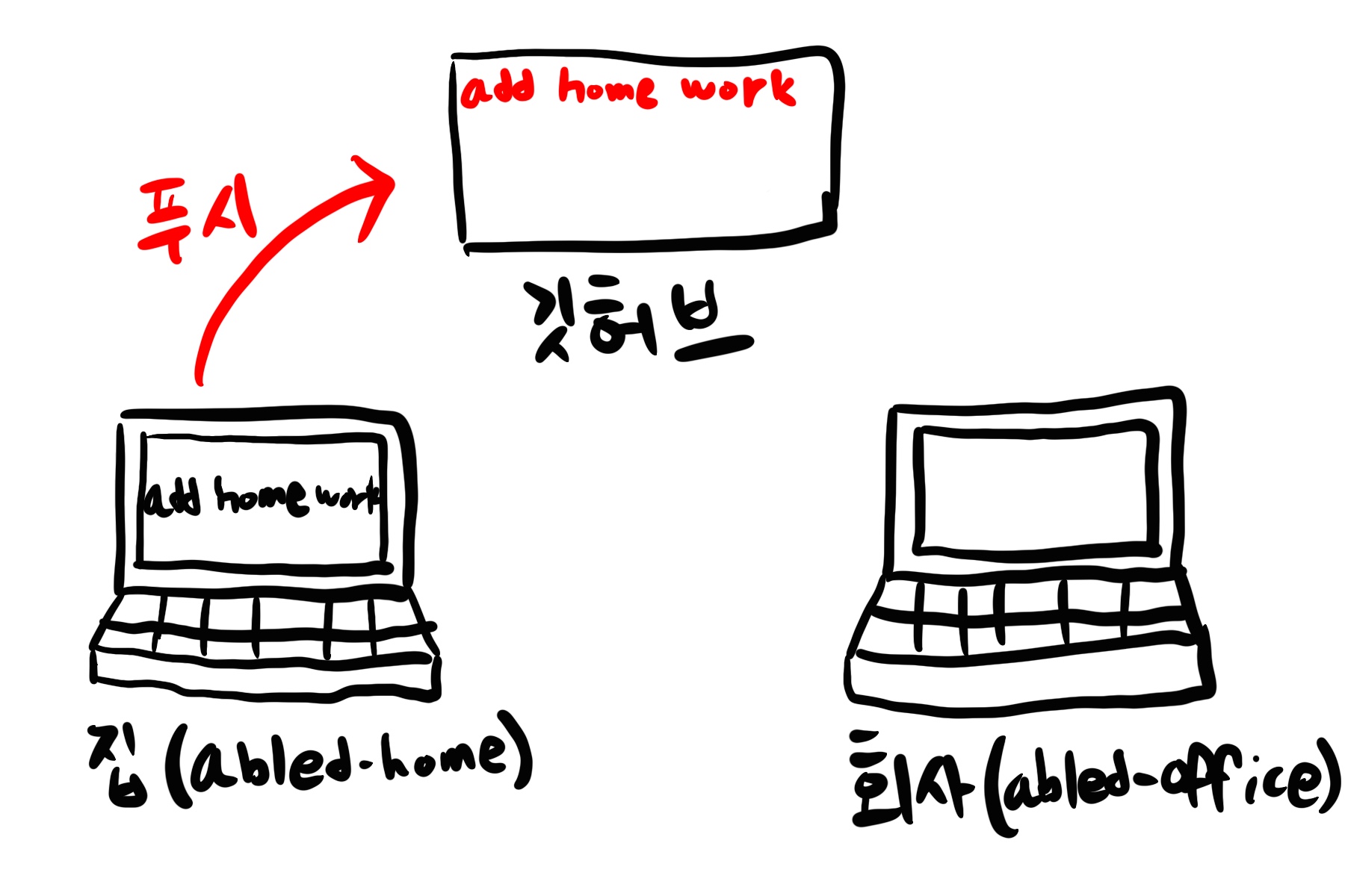 집에서 작업한 것을 커밋하고 푸시했기 때문에 회사 컴퓨터에서 깃허브 리포지토리를 복제했을 때와 현재 깃허브의 리포지토리의 커밋 상황이 달라졌습니다.