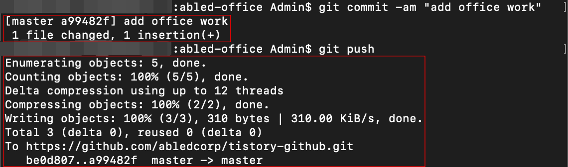 위와 같이 파일을 수정하고 저장했으면 파일을 스테이징하고 "add office work"라는 커밋 메시지와 함께 커밋한 후 깃 리포지토리로 푸시해 주세요!