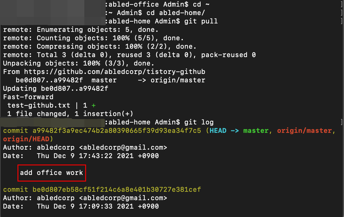 그럼 이제 집에 있는 개인 컴퓨터로 회사에서 작업했던 파일을 풀로 가져와 주시고 이번엔 git log 명령으로 회사에서 푸시했던 'add office work'라는 커밋이 들어와 있는지 확인해 볼게요!