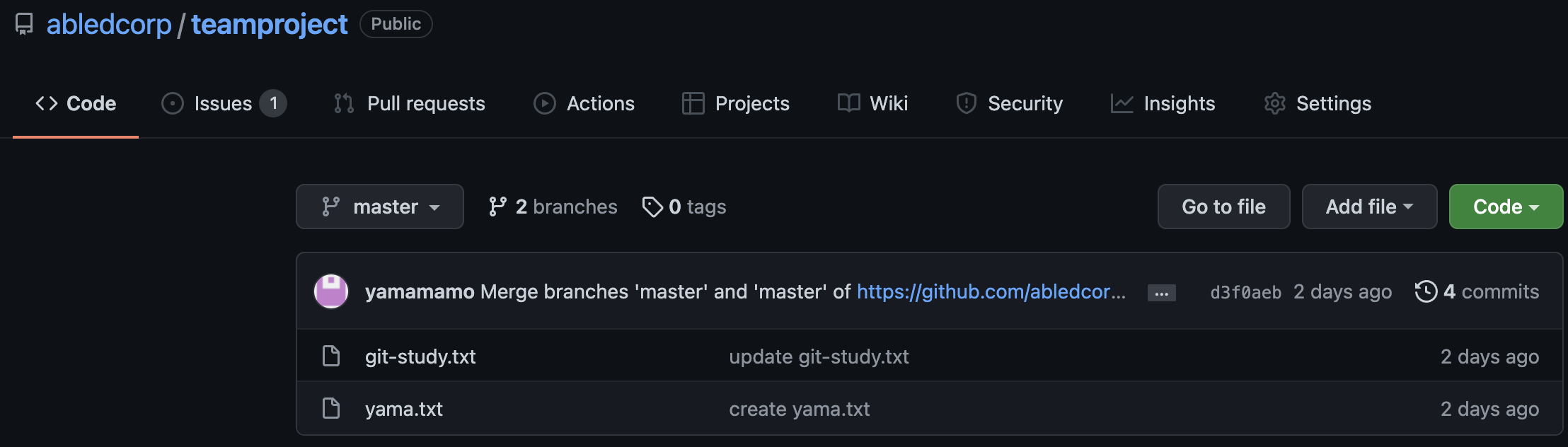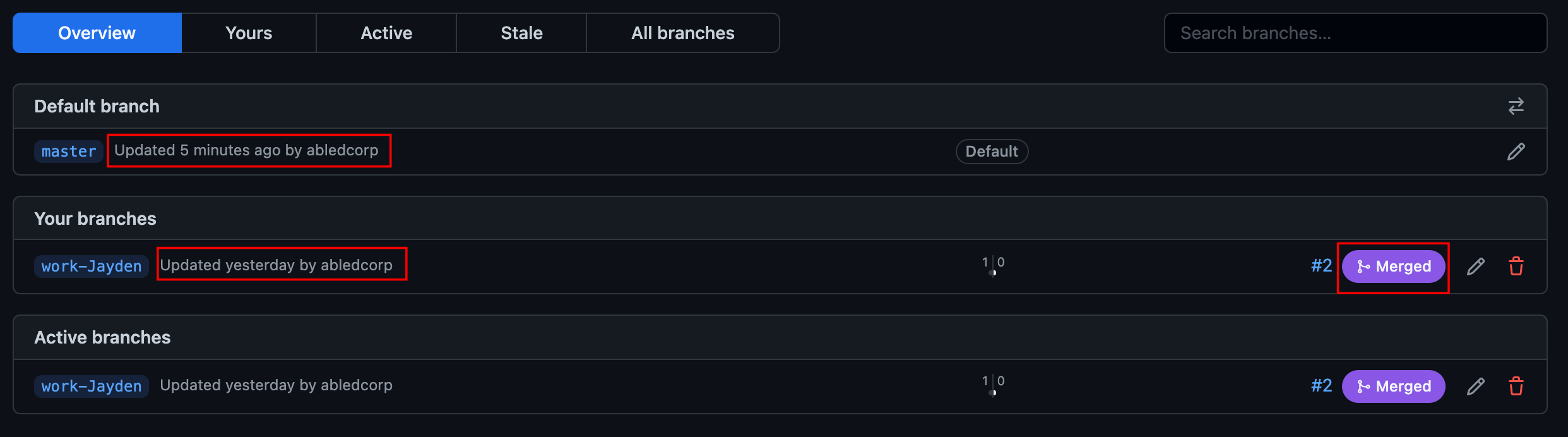 아래의 이미지 처럼 브랜치가 머지된 상태라면 'merged'라고 표시가 되어있는 걸 볼 수 있습니다.