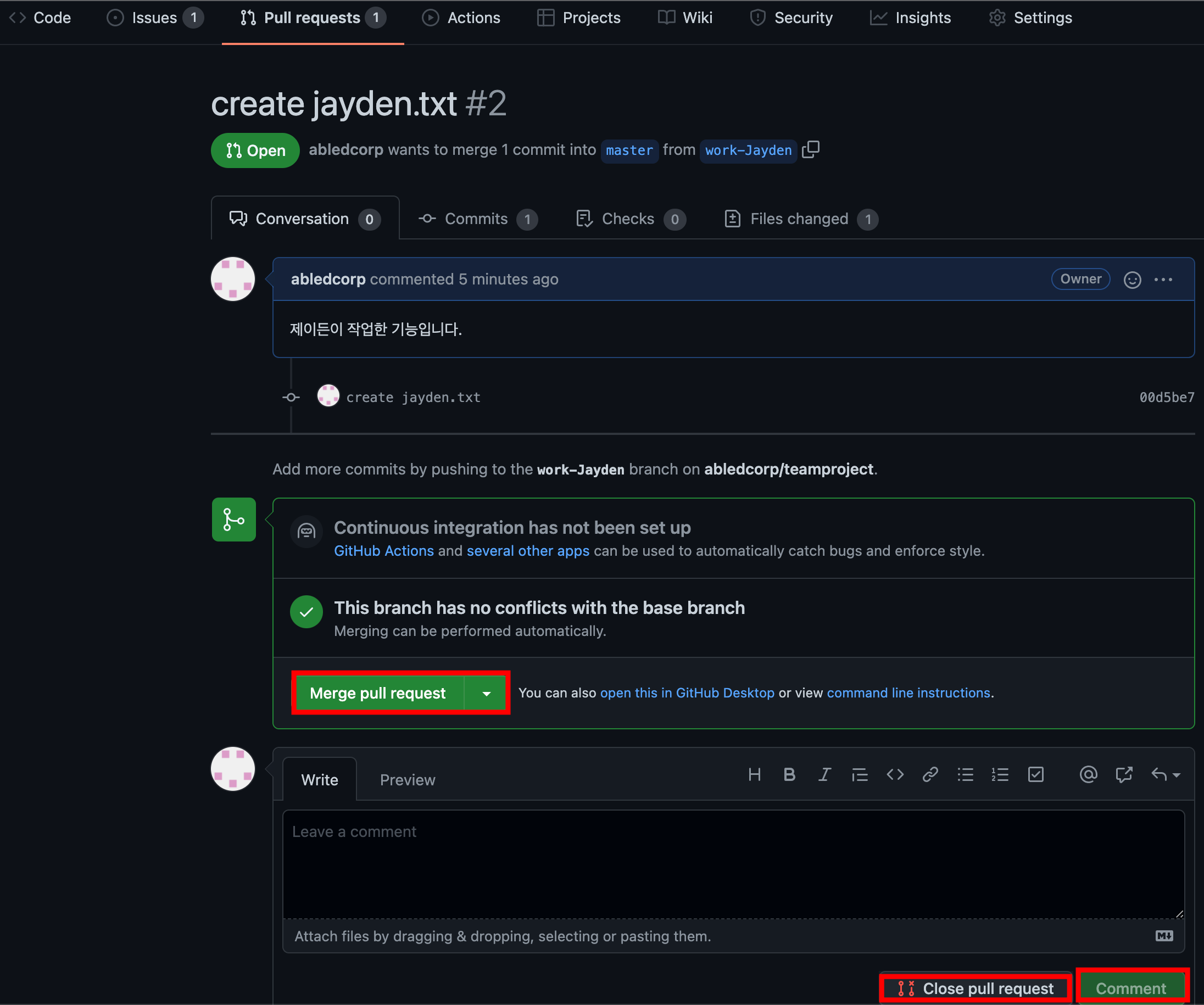 여기서는 'Merge pull request'를 누르도록 하겠습니다.