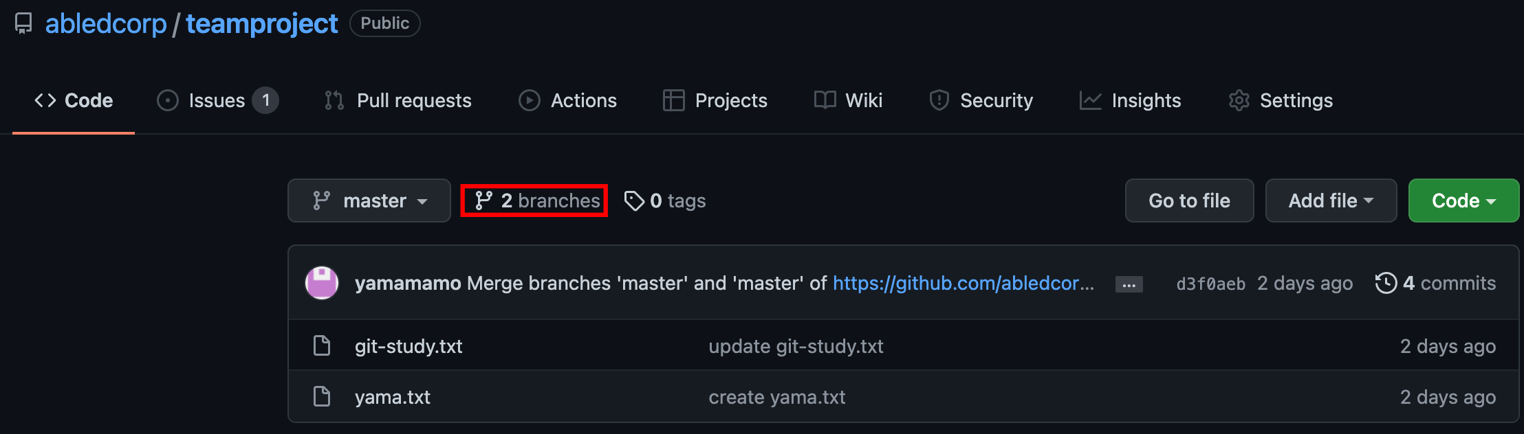 깃허브 리포지토리 화면에서 위의 이미지에 보이는 빨간 박스 안의 'branches'를 눌러주세요!