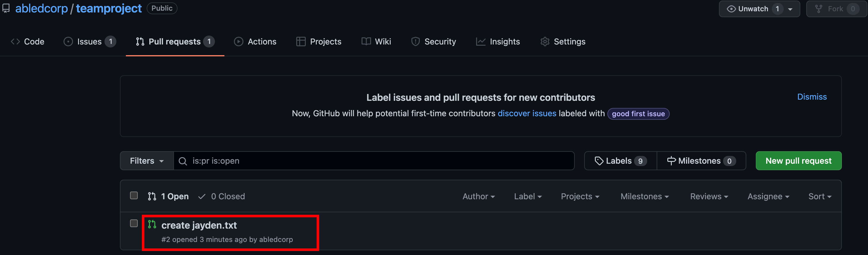 리포지토리 파일 목록 위의 'Pull request'를 누르면 등록된 풀 리퀘스트 목록이 나타납니다.