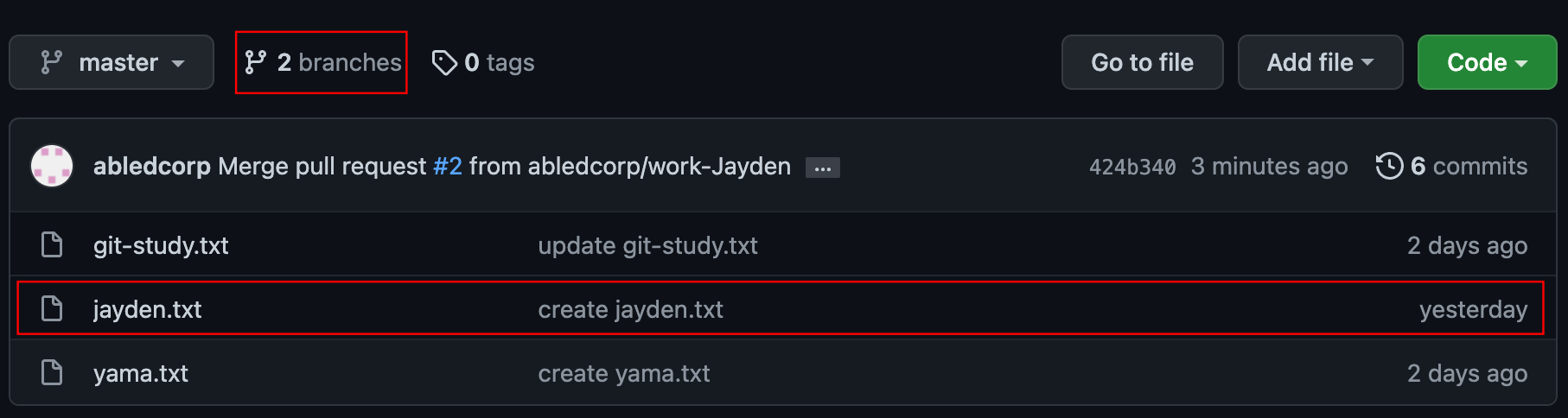 위의 이미지처럼 아직 깃허브 리포지토리에는 work-Jayden 브랜치에서 만들었던 jayden.txt 파일이 없습니다.