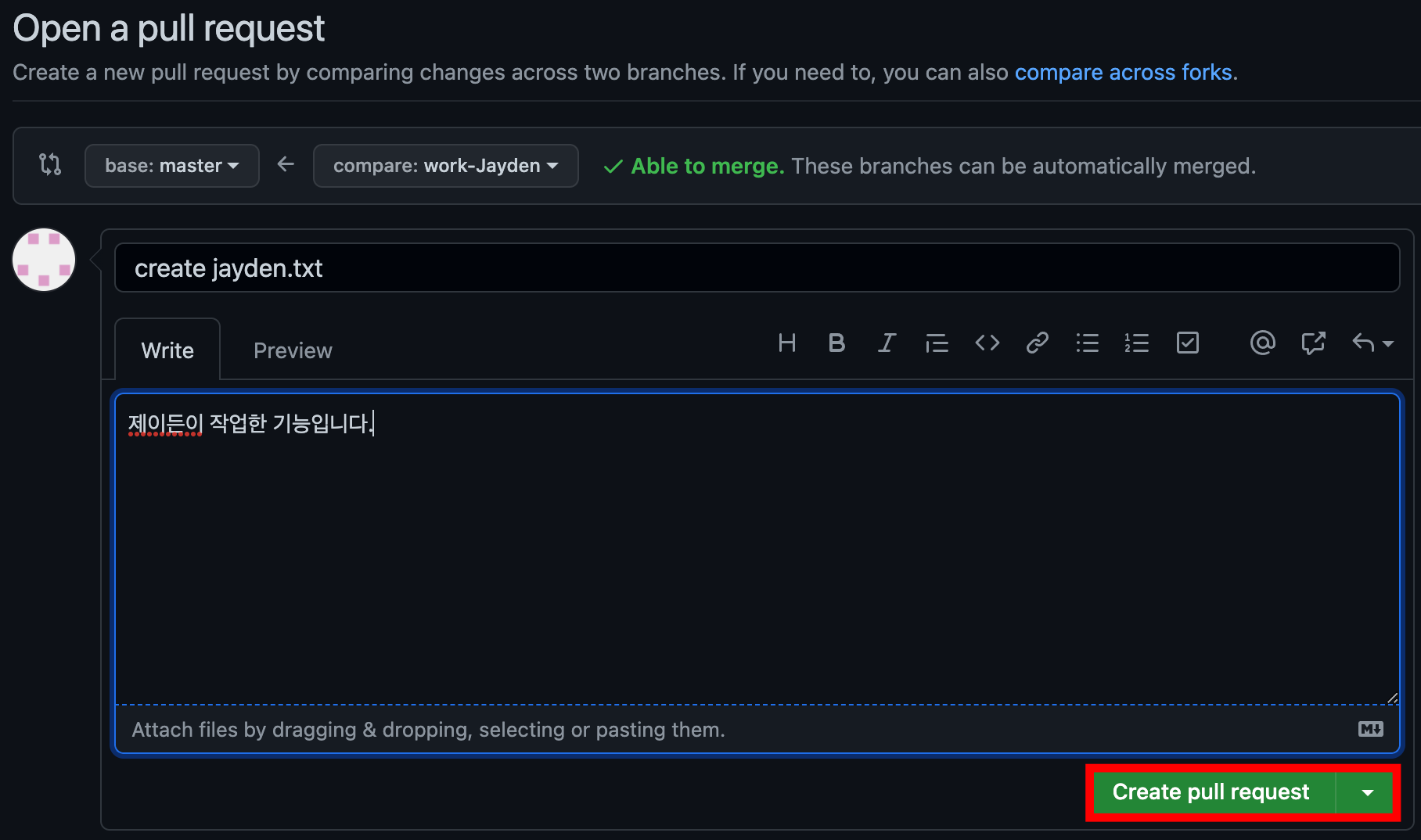 풀 리퀘스트 메시지를 작성한 후 'Create pull request' 버튼을 누르면 협업 중인 리포지토리에 풀 리퀘스트가 전송됩니다.