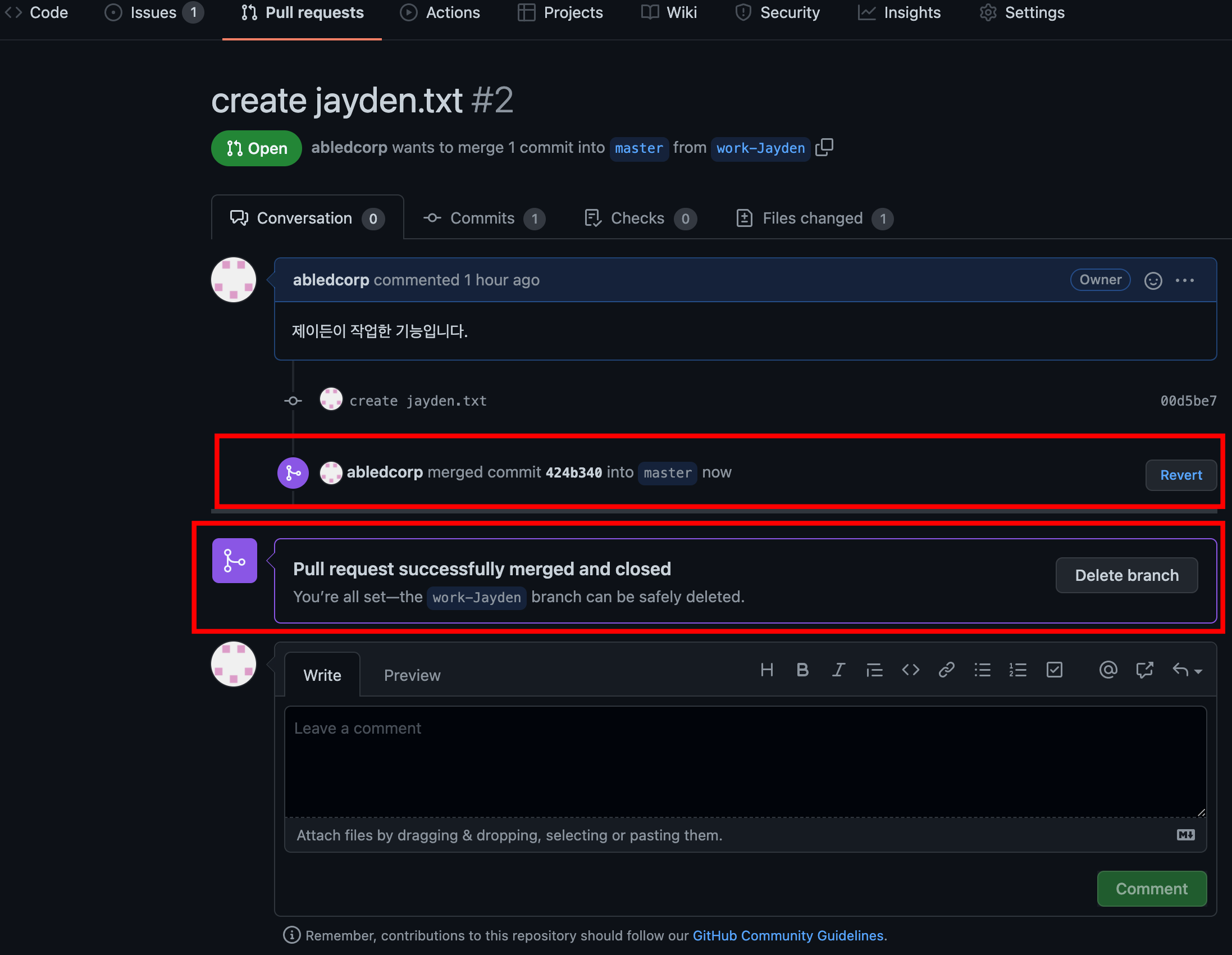필요하다면 풀 리퀘스트를 남긴 사람과 코멘트를 주고받을 수도 있고 풀 리퀘스트를 반려(취소)시킬 수도 있습니다.