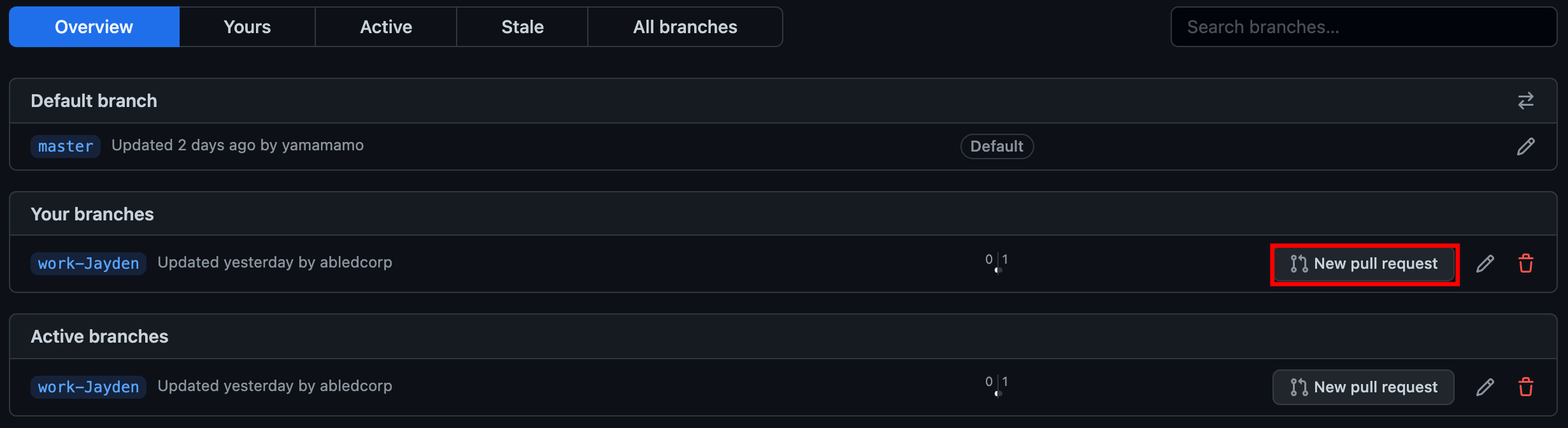 브랜치 설명 옆에 있는 'New pull request'를 눌러주세요.