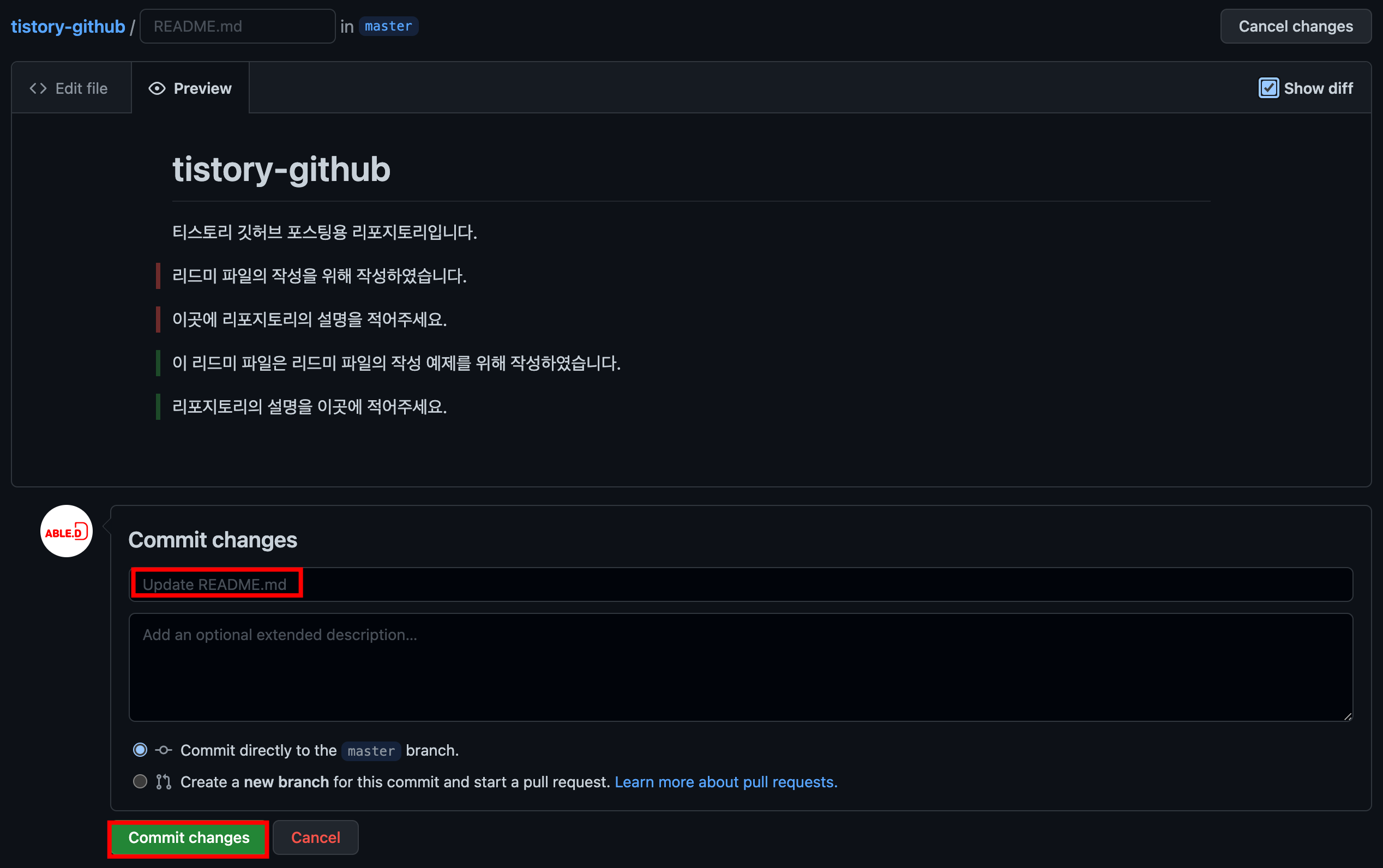 README 파일의 수정을 다 하셨다면 커밋 메시지를 작성하고 'Commit changes'를 눌러서 수정한 내용을 깃허브에 등록해 주세요!