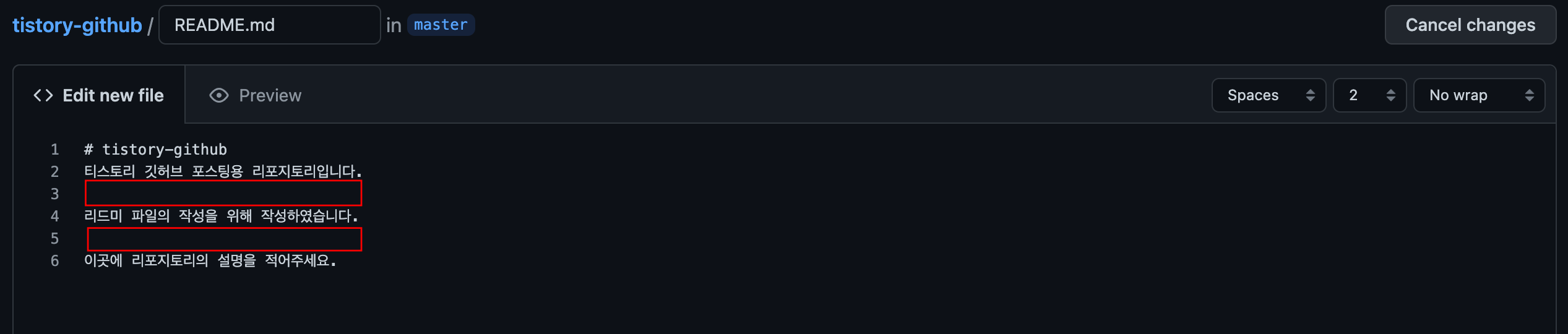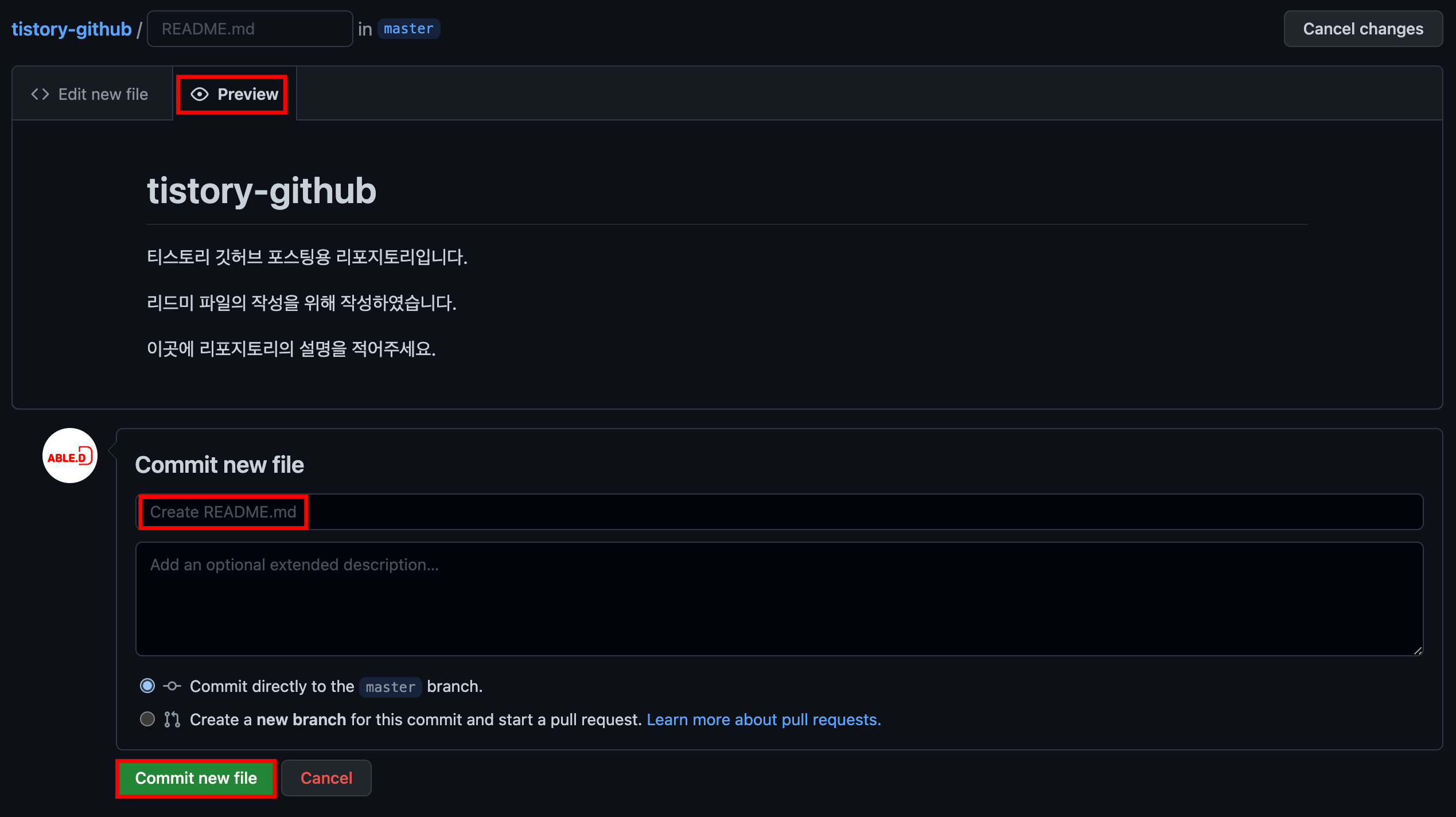 'Edit new file'에서 작성한 후 'Preview'를 눌러 결과 화면을 미리 확인할 수 있습니다.