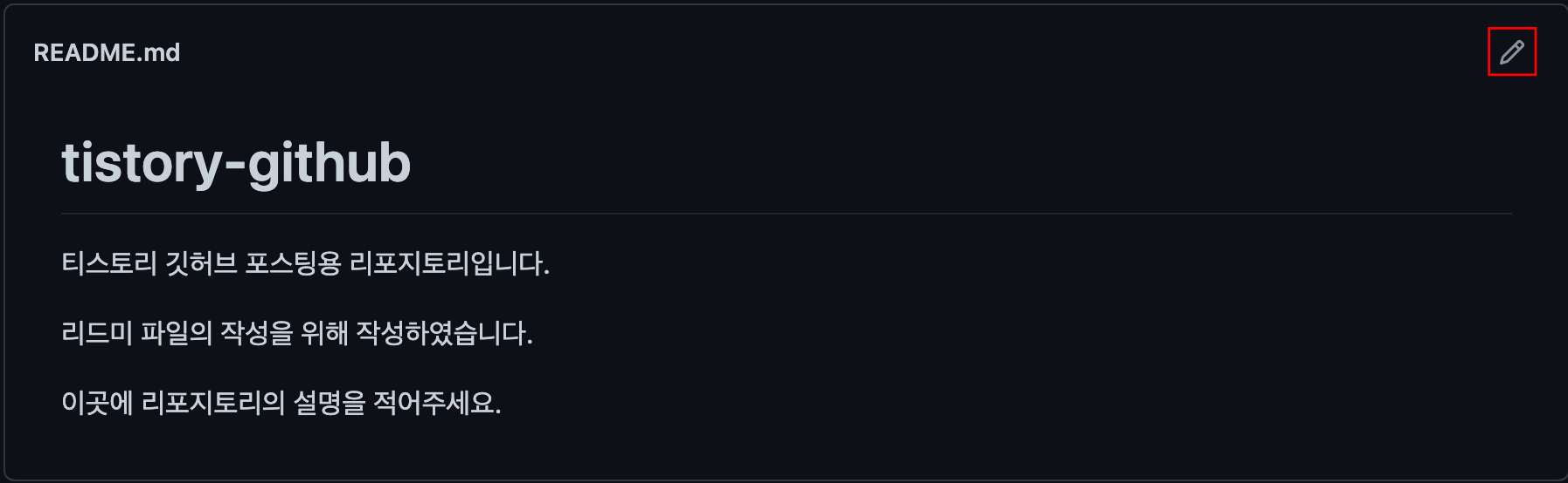 README 파일을 수정하려면 위의 이미지의 빨간 박스 안에 있는 README 내용 오른쪽에 있는 연필같이 생긴 아이콘을 눌러주세요!