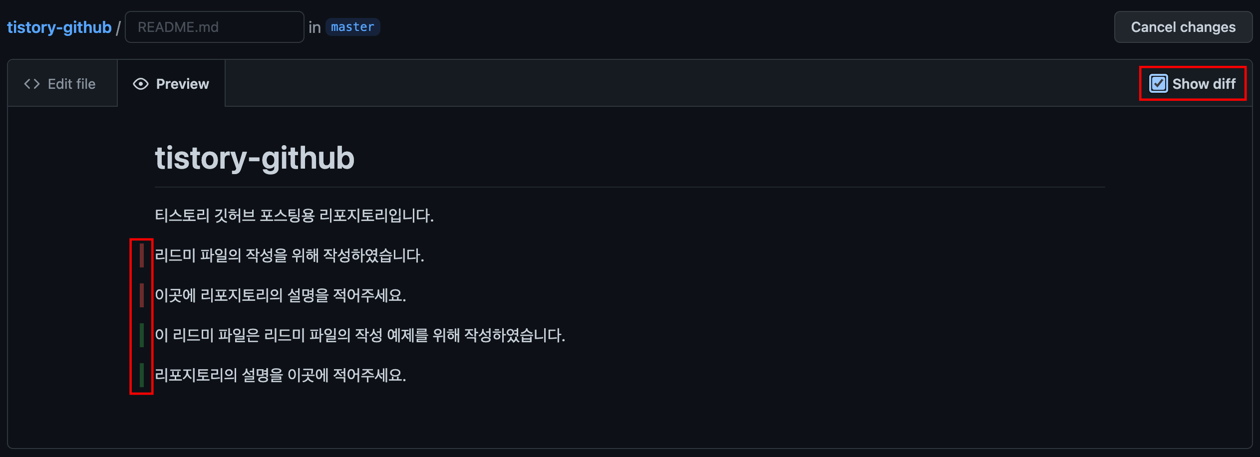 README 파일을 수정한 후 'Preview' 탭을 눌러 Preview 화면으로 가시면 화면 오른쪽 위에 'Show diff'라는 체크박스가 있는데요, 체크박스를 누르면 미리 보기 화면에서 내용 왼쪽에 초록색 막대기와 빨간색 막대기가 표시가 됩니다.