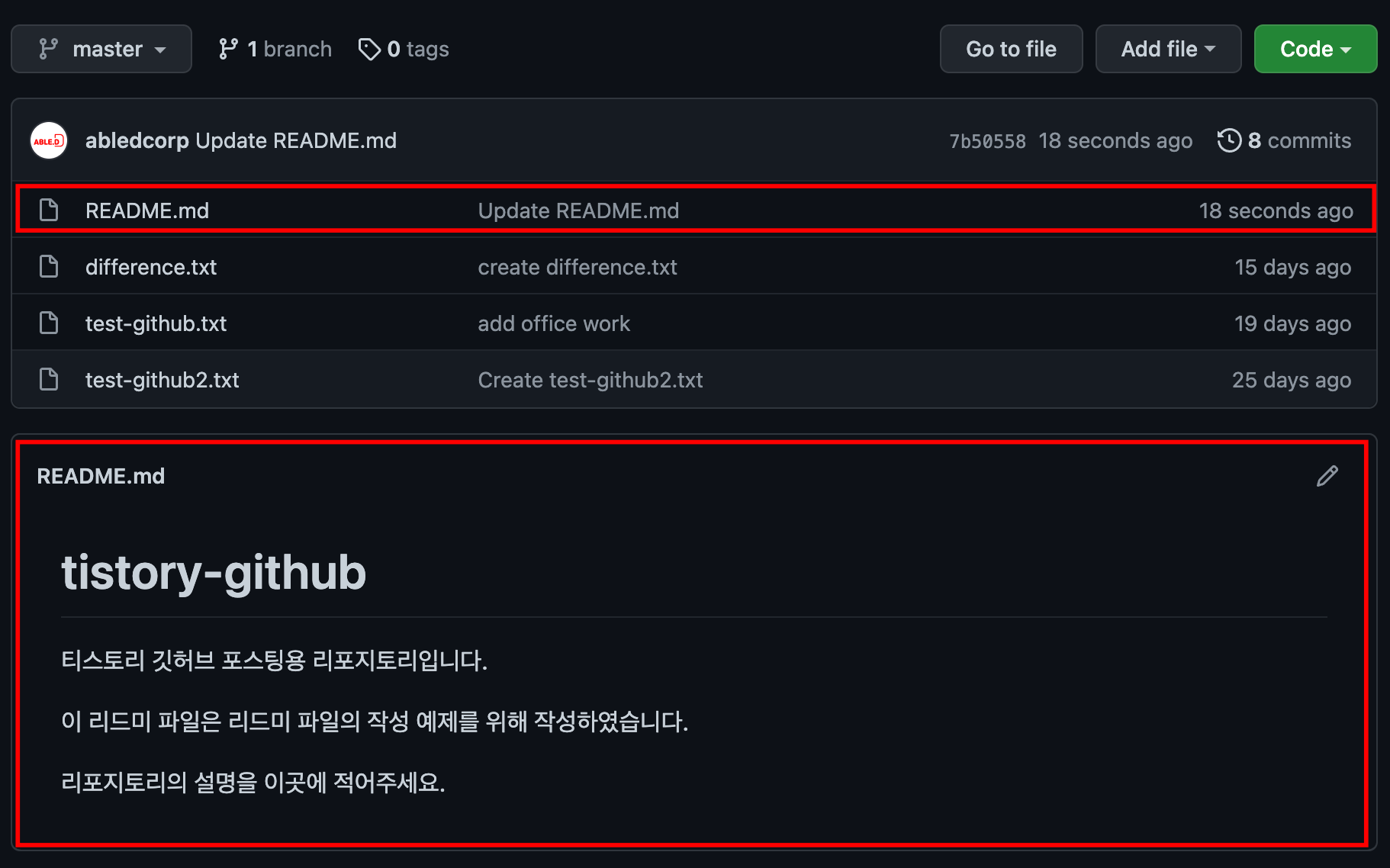 파일 목록에 업데이트된 커밋 메시지와 함께 리드미 영역에도 수정된 리드미 내용을 확인할 수 있습니다!