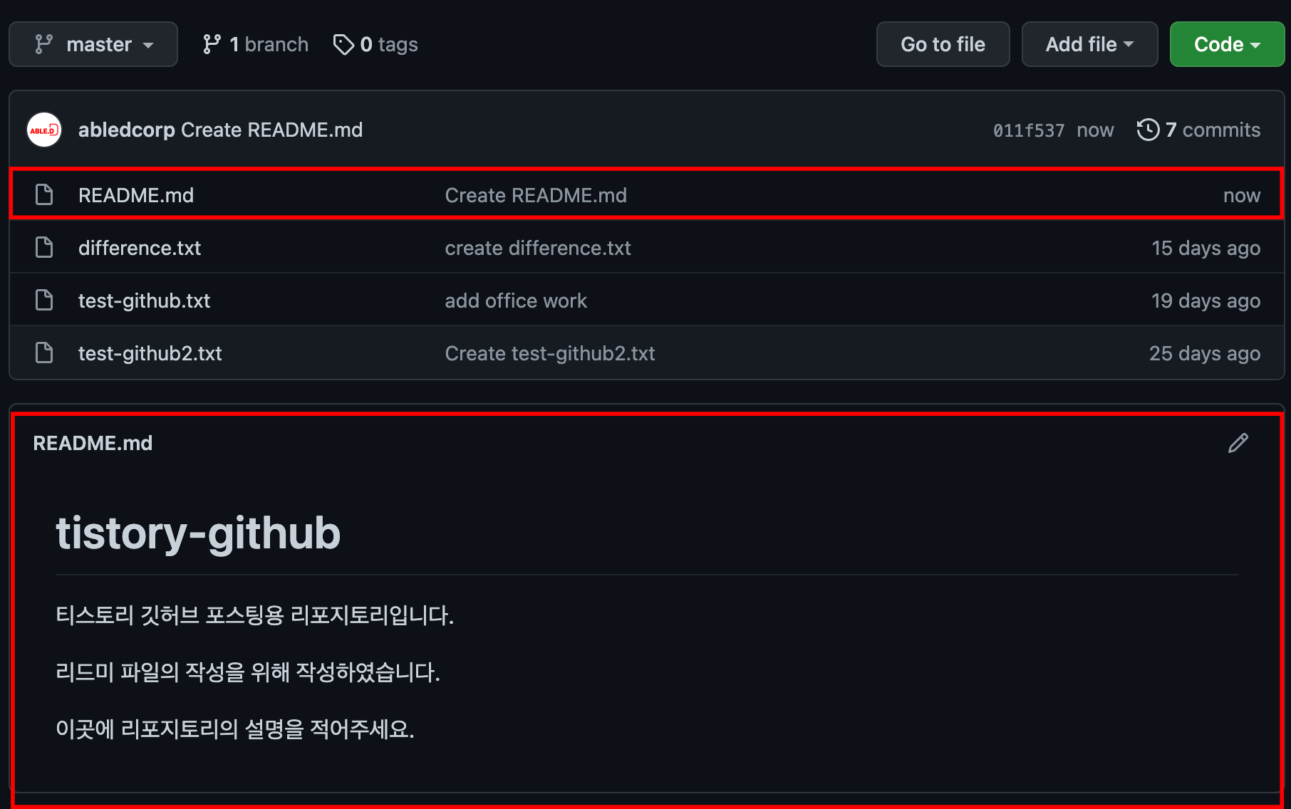 그리고 파일 목록 아래에 작성한 README 파일의 내용이 나타난 것을 확인할 수 있습니다.