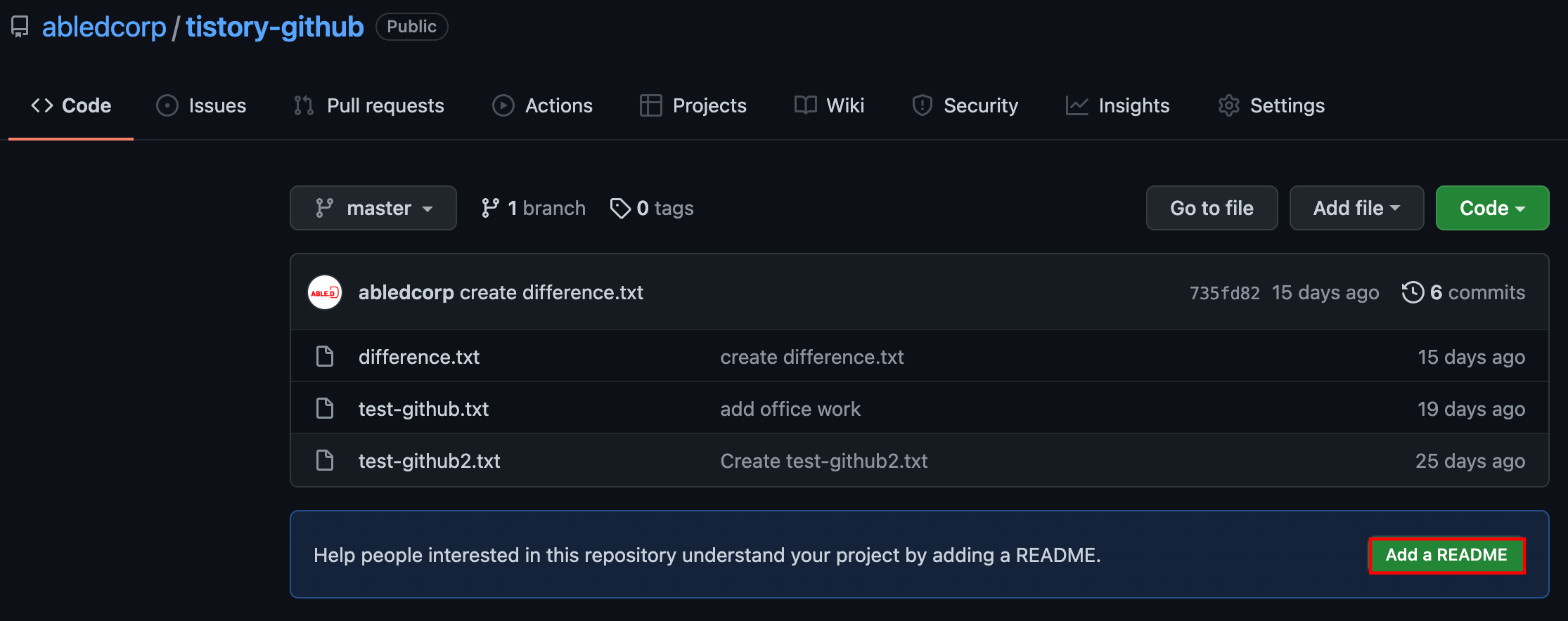파일 목록 아래에 있는 'Add a README'를 누르면 README 새 파일을 만들 수 있습니다.