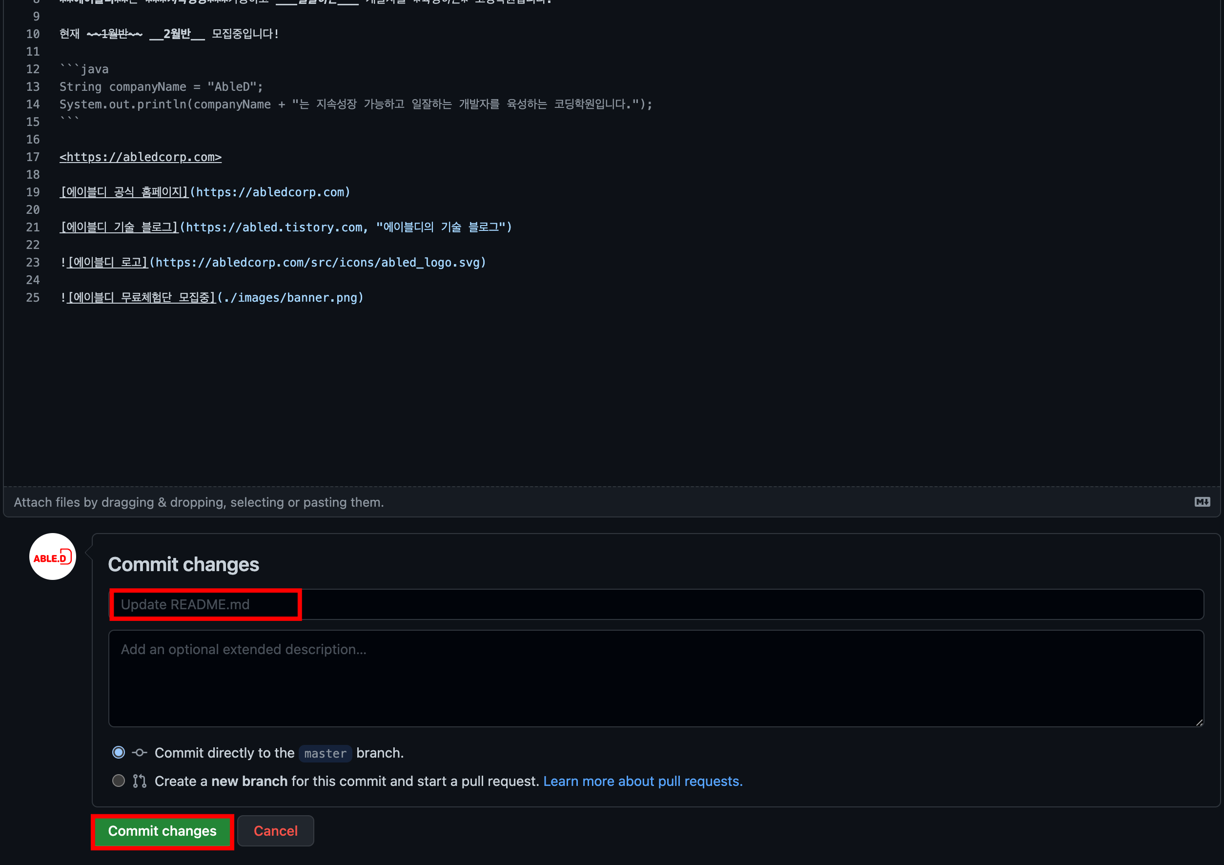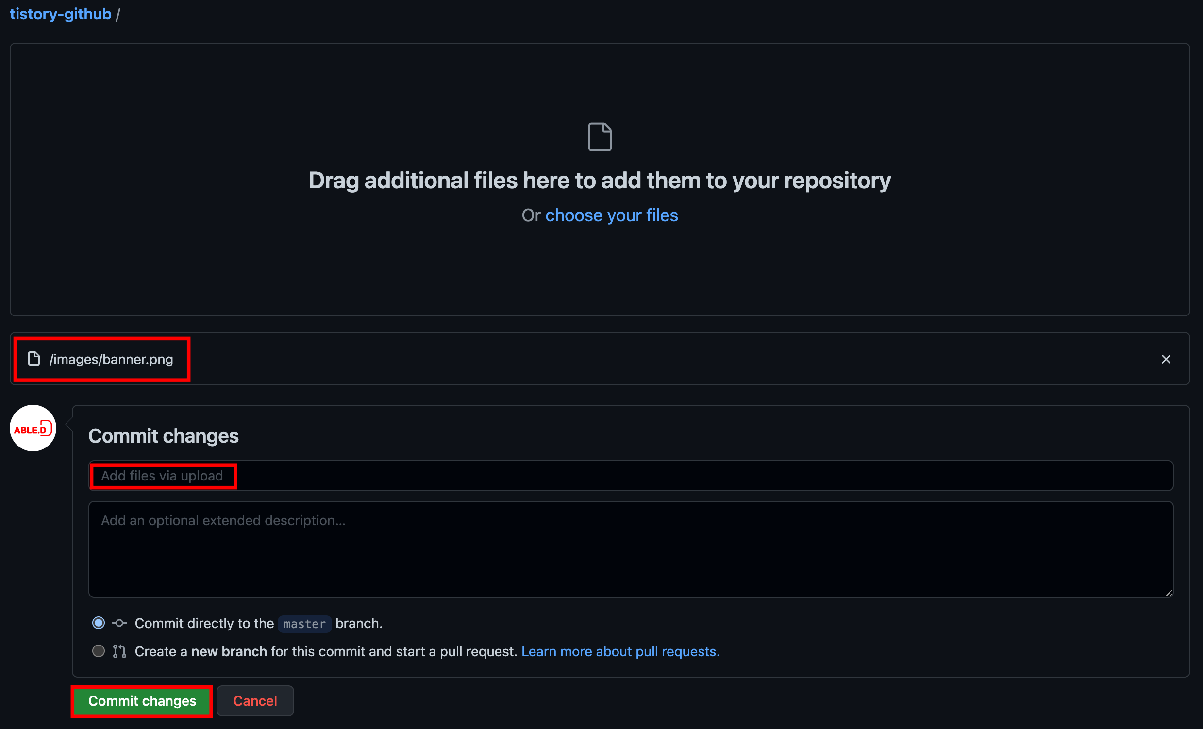 사용하실 이미지를 업로드하셨으면 커밋 메시지를 작성하고 'Commit changes'버튼을 눌러 커밋해 주세요!