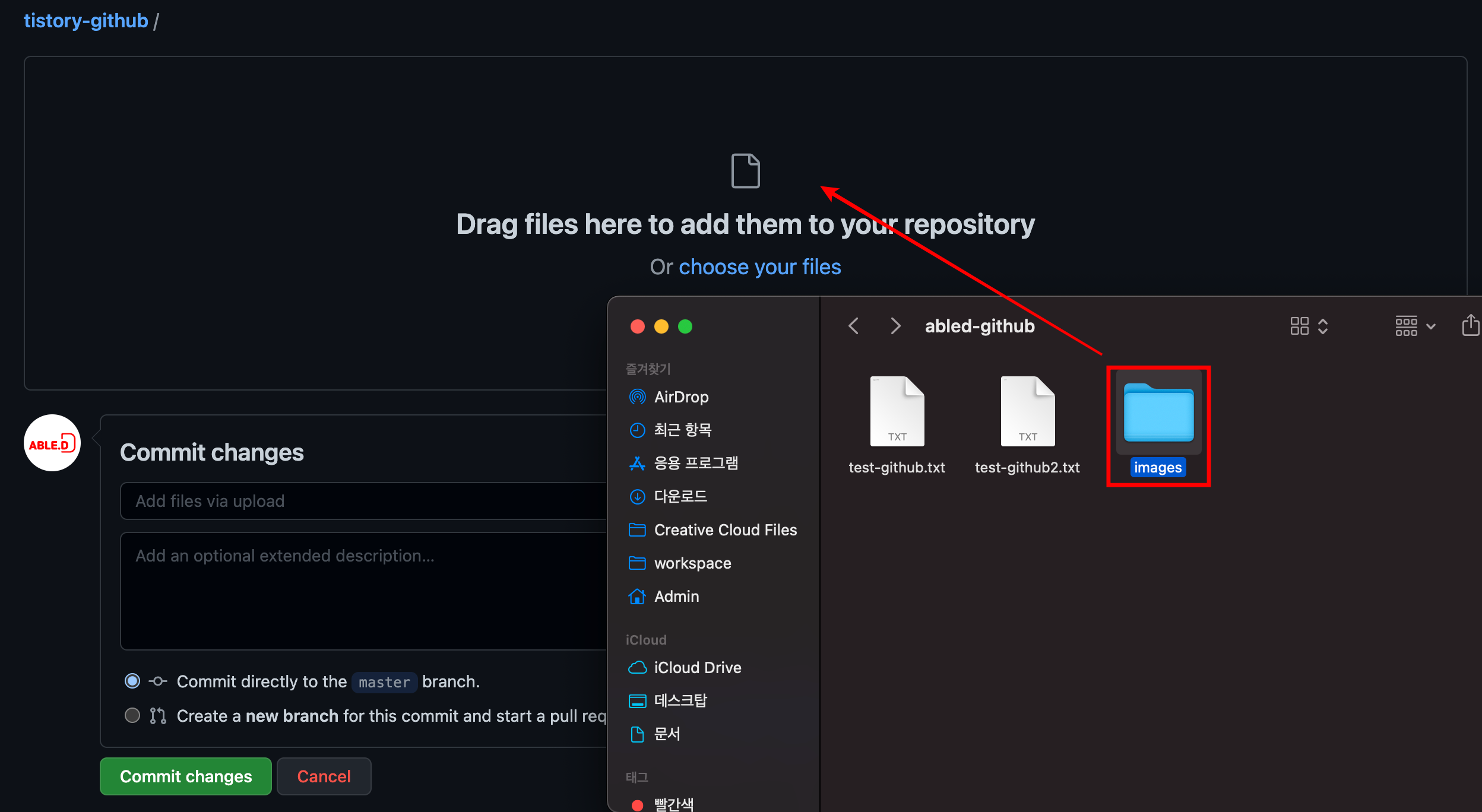 'Upload files'를 눌러 나온 화면에 'Drag files here to add them to your repository'라고 적힌 영역에 조금 전에 만들어 둔 'images'디렉터리를 끌어다 놓아줍니다.