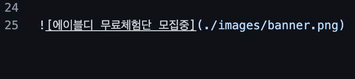 저는 'banner.png'파일을 'images'디렉터리 폴더 안에 넣어 놓았었는데요, 해당 이미지를 리드미에 삽입하려면 아래의 이미지와 같이 작성해 주세요! [] 안에는 대체 텍스트를 작성해 주시고 () 안에 파일의 경로를 적어주시면 됩니다.