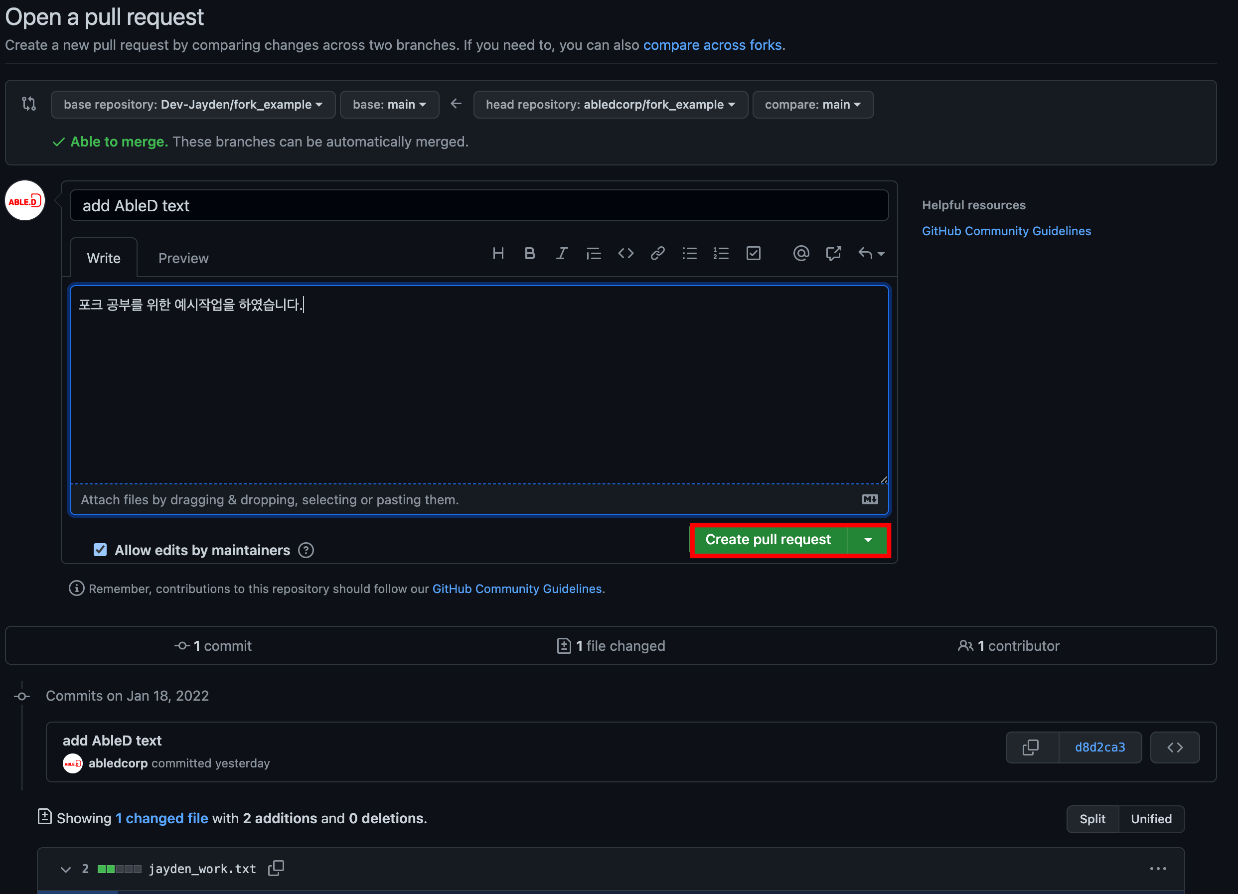 'Open pull request'를 누르면 원본 리포지토리 (Dev-Jayden/fork_example)의 master 브랜치와 복제된 리포지토리(abledcorp/fork_example)의 master 브랜치 사이에 어떤 차이가 있는지, 수정된 파일의 내용도 보여줍니다.