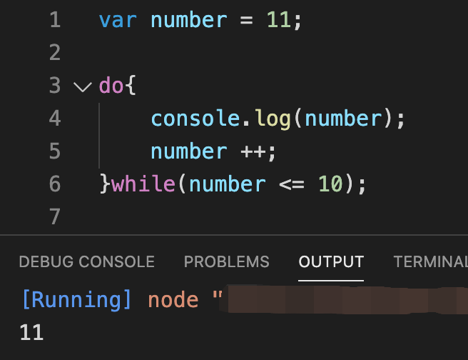 하지만 number를 이번엔 11을 줘서 while의 조건에 충족하지 못하게 세팅해보았는데요, 어떤 값을 출력하는지 확인해 보겠습니다.