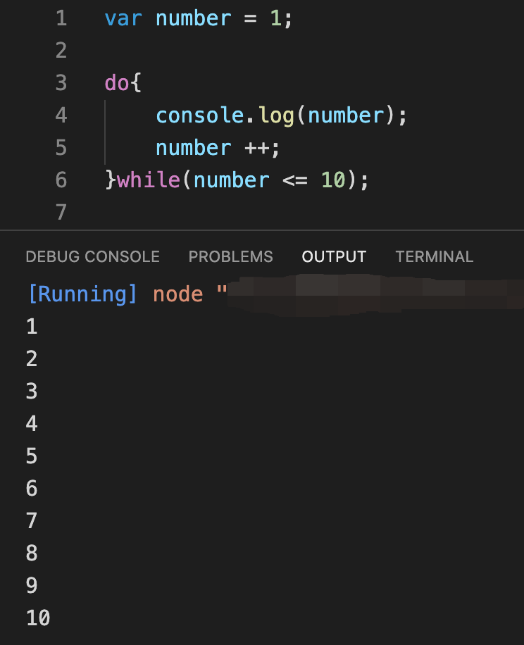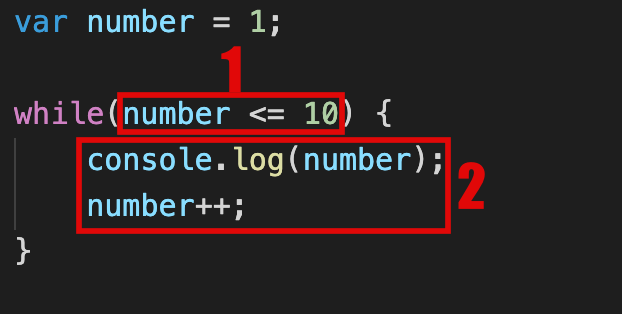 2. 조건을 만족하면 중괄호 안의 코드를 실행합니다. 저는 1부터 10까지만 출력을 하기 위해 while문이 한번 반복할 때마다 number를 1씩 증가시켜 반복 횟수를 제어했습니다. number를 증가시키지 않았다면 number는 10보다 작거나 같은 조건을 계속 만족하게 되어 계속해서 반복문이 동작(무한반복)하게 됩니다.