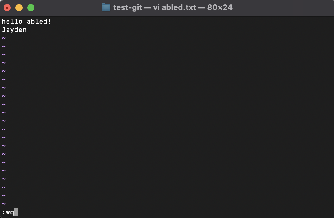 그리고 'Jayden'을 추가한 후 ESC 키를 누르고 :wq를 입력해 문서를 저장하면서 편집기를 종료해주세요.