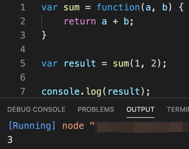 위의 코드를 보면 result라는 변수에 변수 sum을 사용하고 그 결괏값을 result 변수에 할당하여 콘솔로 result값을 확인하는 코드인데요, 인자 값을 1과 2를 주었으니 1 + 2 = 3이 출력되는지 확인해 보도록 할게요!