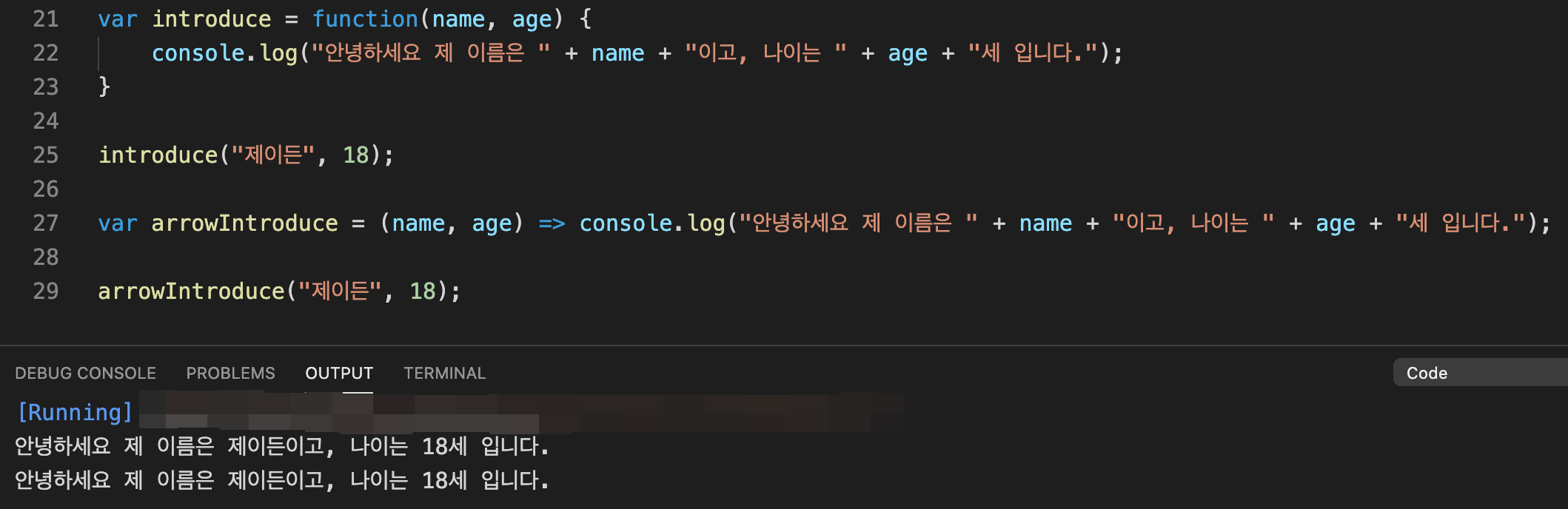 var arrowIntroduce = (name, age) => console.log("안녕하세요 제 이름은 " + name + "이고, 나이는 " + age + "세 입니다.");