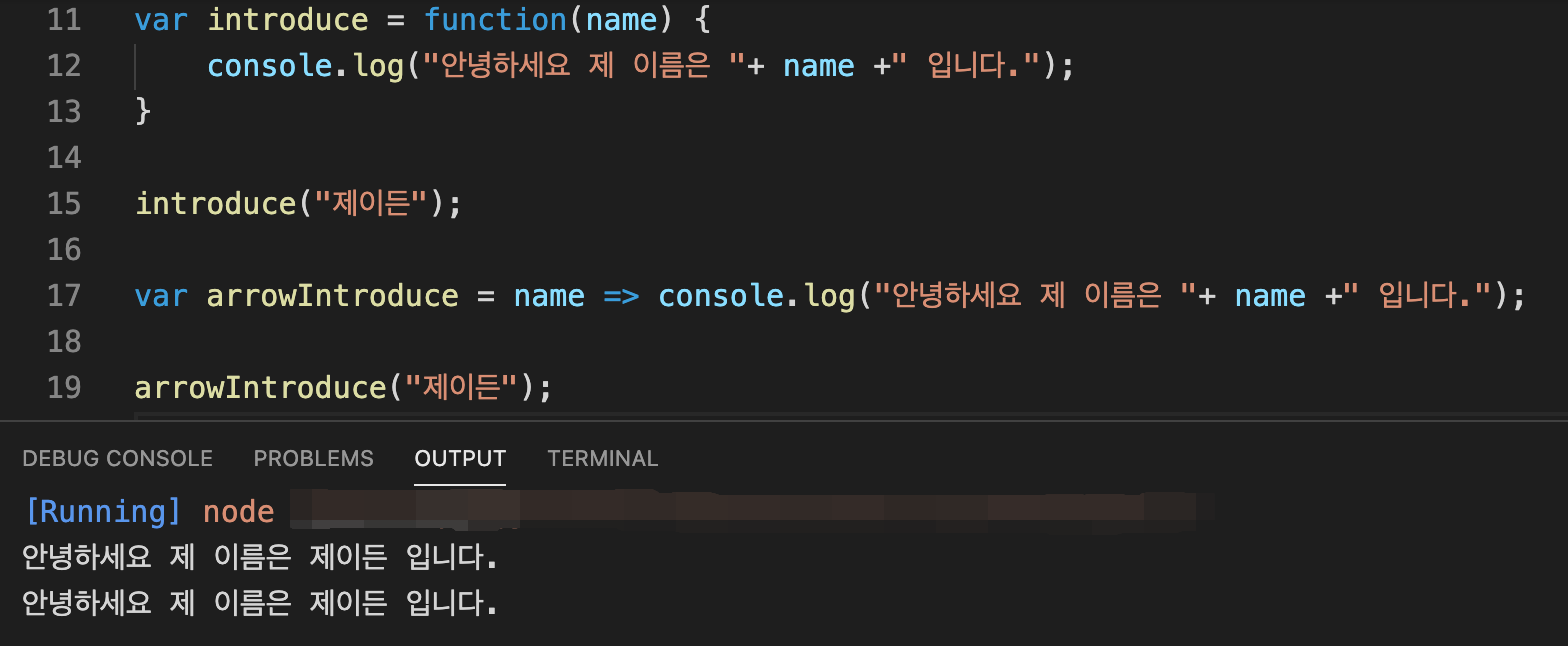 var arrowIntroduce = name => console.log("안녕하세요 제 이름은 "+ name +" 입니다.");
