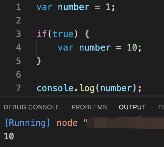 당연히 1이 찍혀야 한다고 생각을 했지만, 위에서 설명한 것과 같이 var로 선언되는 변수는 오로지 함수의 코드 블록 안에서만 지역 스코프로 인정되기 때문에 if문의 코드 블록 안에서 var로 선언한 number 변수가 전역 변수로 취급되어 기존의 전역 변수로 선언했던 number변수와 중복 선언되면서 console.log()를 if문 밖에서 사용했음에도 10이 출력되는 것을 볼 수 있습니다.