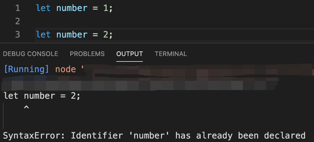 let으로 number란 동일한 변수 이름을 중복 선언하여 보았습니다.
