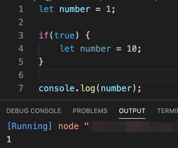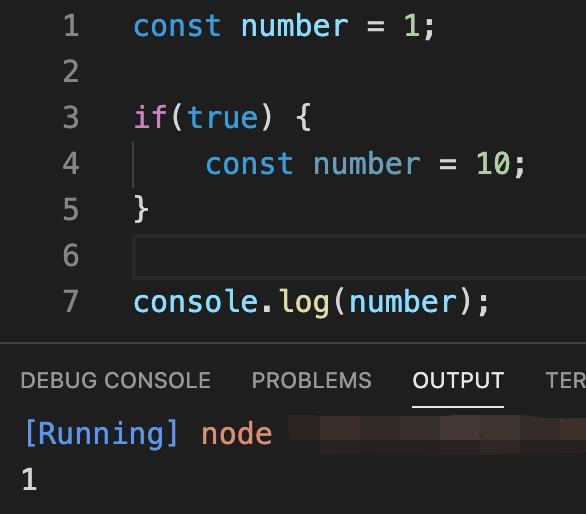 그런데 이번엔 let으로 변수를 선언했는데 블록 레벨 스코프가 적용되어 if문 안의 number변수가 지역변수로 인식이 돼서 전역 변수에 영향을 미치지 않고 1을 출력하는 걸 볼 수 있습니다!
