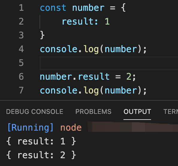 키값 result에 값을 1을 주어 최초에 선언하여 console.log()로 number 객체를 출력하고, 키값 result에 값 2를 재할당하여 다시 한번 console.log()로 number 객체를 출력하는 코드를 작성했습니다.